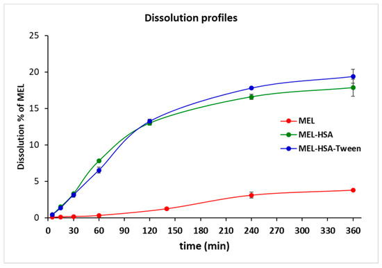 The in vitro dissolution profiles of nanoparticles and solid MEL were investigated in IN circumstances (pH = 5.6). Due to its chemical structure, MEL has a week acidic character (pKa = 3.43, [39]); therefore, its solubility in this medium was poor (6.12 ± 0.19 µg/mL, at 60 min 37 °C). Both MEL-HSA and MEL-HSA-Tween clearly demonstrated that their nanosize and increased specific surface area resulted in a significantly higher dissolution rate than that of pure MEL (****, p < 0.0001). For the MEL-HSA and MEL-HSA-Tween samples, a rapid initial phase was observed for 60 min, followed by a slowing but rising profile. Compared to pure MEL, about a 5 times higher amount, approximately 20% of MEL, was dissolved from the formations within 4 h. Beside this significant increase, we cannot overlook the fact that in the case of the two HSA formulations, the bounded form of MEL was also dissolved due to its rather high binding affinity to HSA (<99%) [46]. At time point of 240 min, the dissolution of MEL from MEL-HSA-Tween was slightly higher than that from the MEL-HSA formulation, but the difference was still significant (**, p = 0.0077), which might be explained by the solubilizing effect of Tween as a surfactant additive. This effect of Tween could be also observed in the flux values in the PAMPA study (Figure 7).