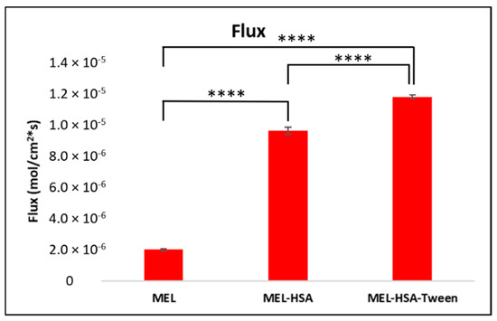 The PAMPA permeability results of MEL-HSA and MEL-HSA-Tween in comparison to solid MEL are shown in Figure 7. Both nanoparticle formulations showed a significantly higher flux compared to pure MEL (MEL-HSA vs. MEL ****, p < 0.001; MEL-HSA-Tween vs. MEL ****, p < 0.001). The increased flux of albumin nanoparticles could be explained by the enhanced solubility of MEL due to the solubilizing effect of HSA. When comparing the flux of MEL-HSA to MEL-HSA-Tween, a significant difference was observed (MEL-HSA vs. MEL-HSA-Tween ****, p < 0.001); thus, beside HSA, Tween also had a remarkable influence on the flux.