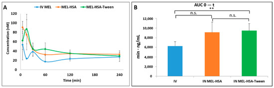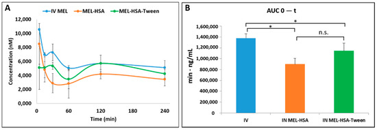 Plasma drug concentration vs. time profiles in rats after intravenous (IV) MEL and intranasal (IN) administration of MEL-albumin nanoparticles (A) and their area under the curve (AUC) value (B). Statistical analysis: t-test. * p < 0.05, n.s. means not significant compared to IV MEL control.