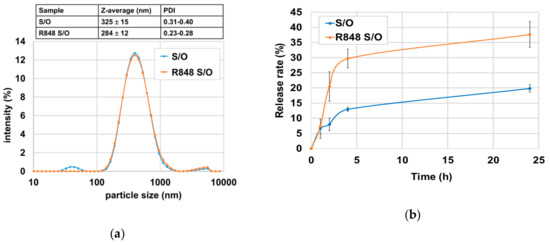 Characterization of the solid-in-oil (S/O) nanodispersions with and without R-848. (a) Particle size distribution; (b) β-lactoglobulin (BLG) release test.