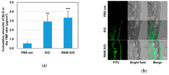 In vitro skin permeation in Yucatan micropig (YMP) skin. (a) Cumulative amounts of Fluoroscein 5-isothiocyanate (FITC)-labelled BLG in the solid-in-oil nanodispersion (S/O) and the S/O with R-848 (R-848 S/O) that permeated through the YMP skin after 24 h of incubation. *p < 0.05, **p < 0.01, ***p < 0.001 compared with the PBS solution (PBS sol.).; (b) Representative fluorescent microscopy images of the YMP skin sections after 24 h of BLG administration.