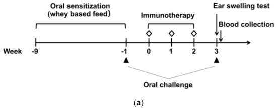 The whey protein diet, AIN-93G-W, in which the milk casein in AIN-93G was substituted with whey protein (WPC392), was custom prepared by Oriental Yeast (Tokyo, Japan). For oral sensitization, 5-week-old mice received the whey protein diet AIN-93G-W for 2 weeks. After a 4-week interval on a CE-2 diet (soy protein-based diet), the mice again received AIN-93G-W for 2 weeks and then were maintained on a CE-2 diet for the remainder of the experiment [15,16]. One week after the final whey feed, mice were challenged orally with 60 mg of whey protein in PBS (0.3 mL) [17]. At 18 h after the antigen challenge, blood was collected from a tail vein. Standard sera for use as a standard in enzyme-linked immunosorbent assays (ELISAs) were obtained from standard model mice maintained on an AIN-93G-W diet for the first 8 weeks, then on a CE-2 diet.