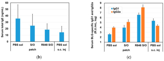 TCIT was performed following the schedule shown in Figure 3a. Mice were treated with a patch containing S/O nanoparticles carrying BLG without (S/O patch) or with (R848 S/O patch) R-848 in an IPM vehicle or a PBS-based solution of BLG (PBS sol. patch) or were subcutaneously injected with a PBS-based solution of BLG (PBS sol. s.c. inj). After BLG immunotherapy via subcutaneous injection or via the S/O nanodispersion system, the serum total IgE levels trended lower (Figure 3b) compared with those in mice patched with a BLG aqueous solution; however, none of these differences achieved statistical significance. Inversely to the relatively low total IgE levels, the BLG-specific IgG subclass levels trended higher in the sera of mice treated with the S/O nanodispersion system (Figure 3c). Specifically, the serum levels of BLG-specific IgG2a trended higher in the S/O nanodispersion group, but not in the subcutaneous BLG injection group, compared with naïve mice. Although the differences did not reach statistical significance, the levels of secreted BLG-specific IgG2a trended even higher following the transcutaneous administration of R-848 with BLG in the S/O nanodispersion system, whereas a similar increase was not observed in mice treated with a subcutaneous injection of BLG.