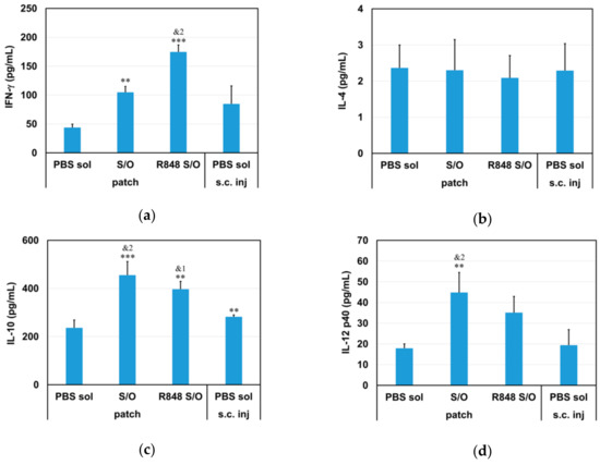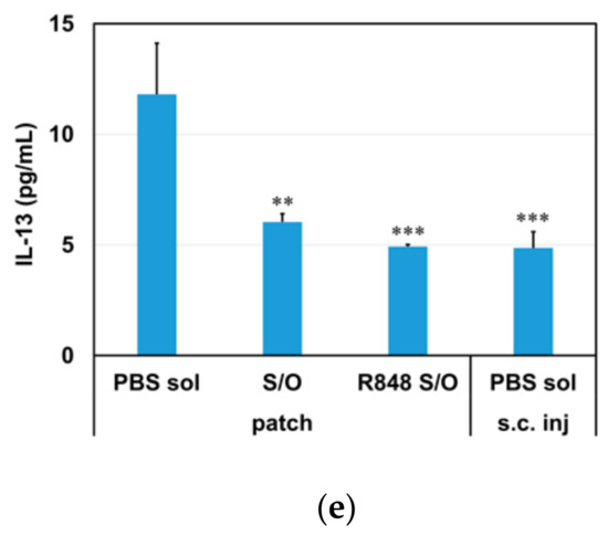 The profile of cytokines secreted by antigen-stimulated cultured splenocytes from the treated mice were examined (Figure 4). Although the IL-4 levels were low overall in the C3H mice used here, and did not differ between the four groups (S/O patch, R848 S/O patch, PBS sol. patch, and PBS sol. s.c. inj), the IL-13 levels were lower in splenocytes from mice administered BLG via the S/O technology (S/O patch or R848 S/O patch) or via subcutaneous injection (PBS sol. s.c. inj) compared with those from the PBS sol. patch mice. In the subcutaneous injection group (PBS sol. s.c. inj), the IFN-γ level was relatively low compared with the higher levels in the S/O groups (S/O patch or R848 patch). Additionally, the IL-10 and IL-12 p40 levels were also relatively higher in the S/O groups.