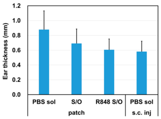 S/O nanodispersion patches were administered to the CMA model mice once per week for 3 weeks. As the CMA model mice showed ear swelling symptoms in a previous report [23], we measured the ear thickness of these mice at 5 min after skin contact with the antigen. The amount of ear swelling trended highest in the group treated with BLG in a PBS-based solution compared with the amounts in the groups treated with S/O nanodispersions or s.c. injections, which had minimal allergic skin responses. Moreover, the amount of ear swelling in the group treated with an S/O nanodispersion that also contained R-848 trended lowest, indicating that this immunomodulator may improve the effectiveness of TCIT.