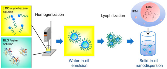 The preparation method for the solid-in-oil nanodispersion. Surfactant L195 in a cyclohexane solution and β-lactoglobulin in a Milli-Q water solution were homogenized, lyophilized, and then dispersed in an isopropyl myristate (IPM) vehicle containing the adjuvant resiquimod (R-848).