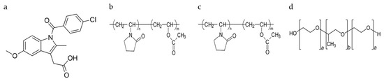 Crystalline INM (1-(4-Chlorobenzoyl)-5-methoxy-2-methyl-3-indoleacetic acid), purchased from Tokyo Chemical Industry (TCI) (Oxford Science Park, Oxford, UK) (N.V.) (Mw 357.79 g/mol−1, Tm 160.0 °C Tg 42 °C) was used as the model drug [5]. INM has an aqueous solubility of 1.5 µg/mL at pH 1.2 [13]. P407, a hydrophilic non-ionic surfactant, (Mw 12,000, Tm 55 °C, Tg −67 °C) and PVP VA64 (Mw 45,000, Tg 107 °C, Tm 140 °C) was purchased from BASF Europe GmbH (Burgbernheim, Germany) [5]. PL-S630 (Mw 47,000, Tg 106 °C, Tm 140 °C) was received as a gift from Ashland Specialties Ltd, (UK) [6]. All other chemicals and reagents were purchased from Sigma Aldrich (Wicklow, Ireland) and were of analytical reagent grade. The chemical structures of the materials used in this study are shown in Figure 1.