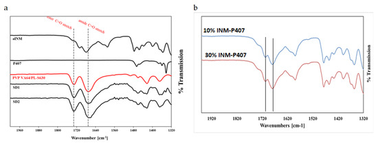 There was no change in the vinyl acetate C=O carbonyl due to weaker hydrogen bonding potential of the vinyl acetate carbonyl as reported by Yuan et al. (2015) as shown in Figure 2b [22]. Any P407 peaks within the pure P407 sample were completely absent in the ATR-FTIR spectra of the SD formulations as shown in Figure 2a and Figure 3. This indicates that P407 possibly has no intermolecular interaction with INM at the molecular level [9].