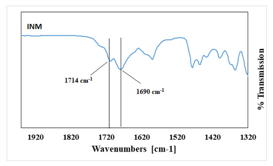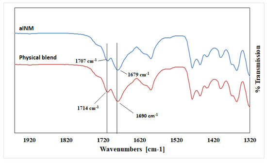 Pure INM contains two strong non-hydrogen bonding C=O bands at 1690 cm-1 (acid-acid dimer C=O stretch) and 1714 cm−1 (free C=O of carboxylic acid) respectively [23]. The hydrogen-bonded O–H stretch of the acid, shown in Figure 4, is overlaid on the C–H sharp stretches, as literature has reported that the free carboxylic acid O–H stretch as a result of hydrogen bonding can exist as dimers [23]. It is also important to note that in the ATR-FTIR reference spectrum of aINM, the two C=O bands at 1714 cm−1 (free C=O of carboxylic acid) and 1690 cm−1 (acid-acid dimer C=O stretch) shifted to 1707 cm−1 and 1679 cm−1, respectively, due to transformation to its amorphous form [5], as shown in Figure 2a, therefore do not align with the polymer peaks. The physical blends contained crystalline INM as expected as shown in Figure 3 [5].