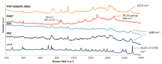 The acid vC=O present at 1702 cm−1 (free C=O of carboxylic acid) of INM disappears in the Raman spectra of the quaternary and ternary SD formulations due to the low intensity of INM. Based on the Raman spectra in Figure 5, the peaks identified in the Raman spectra of aINM were not present in the Raman spectra of the amorphous SD formulations. The broad peak at 1482 cm−1 in the Raman spectrum of solid-state P407 reflected the deformation vibration of the δCH2 group.