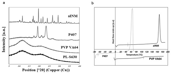 (a) XRPD diffractograms of the pure components and (b) hyper DSC thermograms of pure components after heating at 100 °C/min to 180 °C. INM is transformed to the amorphous form. (b) Hyper DSC shows that pure P407 displays an endothermic peak at 57.13 °C due to its semi-crystalline nature. Glass transition temperature [Tg] is indicated by a tick.