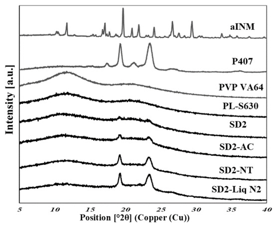 XRPD was used to examine the amorphous nature of the drug within the SD formulations. XRPD was performed on a PANalytical Empyrean X-ray diffractometer attached to a computer running High Score Plus to collect and process data. The XRPD of INM shows multiple Bragg peaks similar to the literature values reported for INM [8], indicating the crystalline nature of the drug, as shown in Figure 6a. Figure 6a also shows the XRPD diffractograms of P407, PL-S630 and PVP VA64. Figure 7 shows the XRPD diffractograms of the SD formulations used to investigate the effect of cooling.