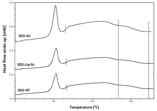 To investigate the crystallization tendency of the API, a selected SD formulation was air cooled [AC] to 25 °C by an air pipe connector attached to the 2 mm die of the extruder, cooled to normal room temperature (25 °C) [NT], the same as air cooling except with no air pipe connector and quench cooled using liquid nitrogen, [Liq N2], to examine the effect of slow and rapid cooling processes on the amorphous stability and solubility of INM. For the purpose of this study, only one SD formulation was investigated.