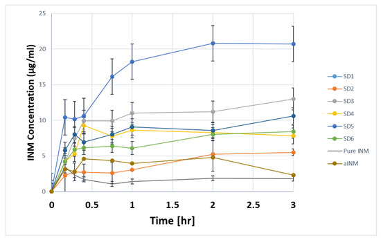 The in vitro dissolution rates of INM and selected SD formulations, shown in Table 9 and Table 10, were performed using non-sink conditions in pH buffer 1.2. Table 9 shows the concentration of INM (µg/mL) at various time intervals over 3 h. Control of the particle size of each formulation was vital in this study, as it can affect dynamic solubility of each formulation. The particle size of each formulation was 200 microns to ensure uniformity. The formulation equal to 100 mg of INM was placed within the dissolution vessels.