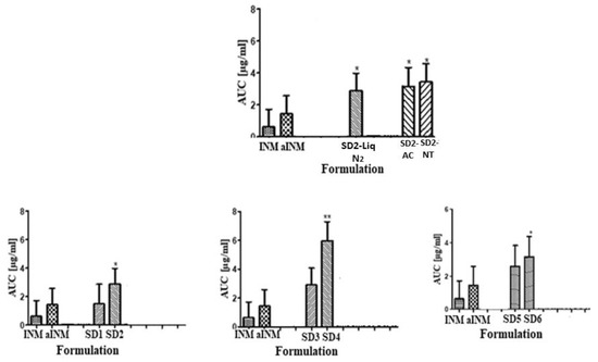Graphical representations of AUC of quaternary and ternary SD formulations in pH 1.2. ** and * represents the statistical difference (p < 0.05) between ASD, amorphous INM and pure INM respectively, for the one-way ANOVA and Tukey–Kramer post hoc test. (AC = Air cooled, NT = Normal room temperature and Liq N2 = Liquid Nitrogen).