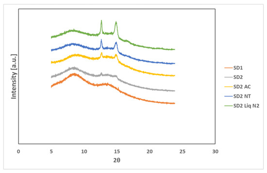 XRPD diffractograms of SD formulations and XRPD diffractograms of the SD formulation used to investigate the effect of cooling after 5 months of a stability study under accelerated conditions of 40 °C and 75% RH. P407 was still present in its crystalline form in all formulations (AC = Air cooled, NT = Normal room temperature and Liq N2 = Liquid Nitrogen).