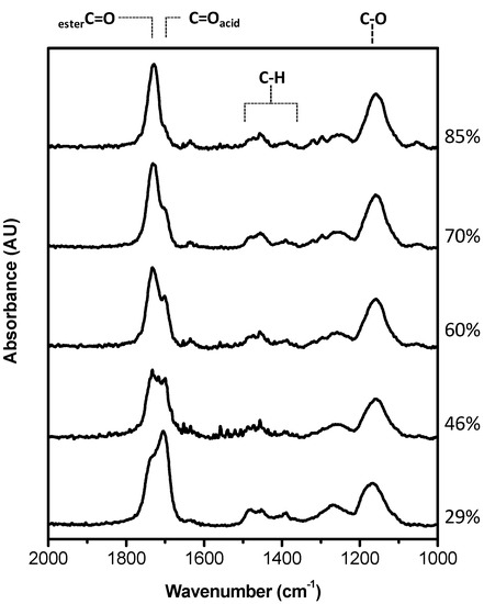 MAA-EGDMA copolymers were deposited by iCVD varying the fraction of the crosslinker, EGDMA. The chemical analysis of the different copolymers measured by FT-IR is shown in Figure 1 in the range 1000–2000 cm−1 and in Supplementary Materials Figure S1 in SI on a larger wavenumber range. The copolymers are characterized by the O–H stretching band relative to the acid group of MAA at 3250 cm−1, the carbonyl stretching band, due to carboxylic acid and ester moieties, in the range 1700–1800 cm−1, and the C–O band at 1150 cm−1 attributable to both monomers structure. In Figure 1, it can be appreciated that the carboxylic C=O absorption is composed of two contributions, one at 1703 cm−1 and the other at 1730 cm−1, whose relative intensity changes with the composition of the coating. The former is due to the acid carboxylic groups, while the latter component can be attributed to ester moieties.