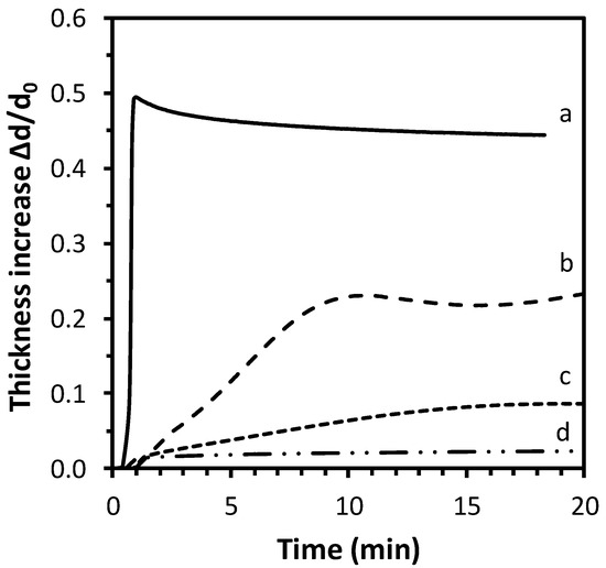 Swelling behavior, in terms of thickness increase, Δd/d0, of different iCVD coatings with 29% (a), 60% (b), 70% (c) and 85% (d) EGDMA. The error bar in the measurements is ±1%.