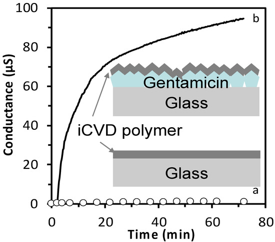 The gentamicin release was assessed by measuring the conductance of the released solution. Before investigating the drug release, the variation of conductance due to drug-free iCVD polymer in solution was evaluated. Figure 3 shows a comparison between the conductance of a drug containing layer (300 µg gentamicin solution 10 mg/mL, drop casted) with a iCVD polymer (200 nm thick, 46% EGDMA) on top and the same iCVD polymer without gentamicin. The sample containing gentamicin, once dipped in pure water, lead to a variation of conductance of almost 100 µS in 72 min, differently from the gentamycin free iCVD polymer that gave negligible conductance variation. This result indicated that the iCVD coating does not influence the detection of the drug.
