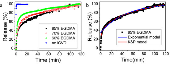 (a) Percentage of released gentamicin from spin coated samples ([Gent] = 100 mg/mL, v = 1500 rpm) without iCVD coating and coated with a 200 nm iCVD layer with different EGDMA volume fractions: 60%, 70% and 85%. Average values obtained measuring the conductivity of three replicates, a maximum standard deviation of 12% was estimated for each data point. Total content of gentamicin is 45 ± 5 µg/cm2. (b) Gentamicin release data for the 85% EGDMA polymer coating fitted with the exponential model of Equation (1) and with the Korsmeyer and Peppas model.