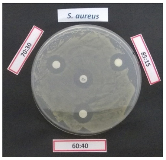 An example of inhibition halo produced by gentamicin loaded cellulose disks coated with different iCVD polymer against S. aureus DSM799 is presented in Figure 5.