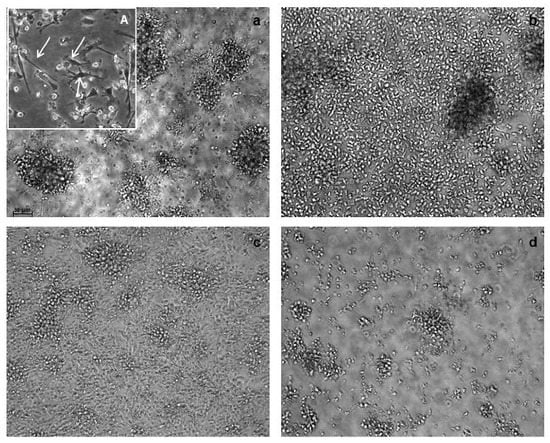 Morphological characterization of dendritic cells (DC). Images are from light microscopy at 20× magnification. Fast-DC cultivated in absence of PGE2 (a) resulted strongly adherent to culture surface respect to Fast-DC cultivated with PGE2 (b). Adherent cells are evident and point out by arrows in 40× magnification image (A). Pictures (c,d) represent standard method DC respectively without PGE2 and with PGE2. The absence of PGE2 results in higher percentage of adherent cells also in the standard method.