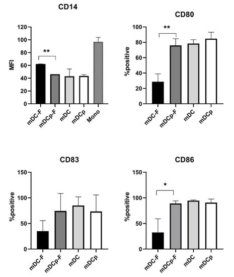 Phenotypic analysis of DC. Summarizing graphs represent the results of the FACS analysis on Fast and standard method DC both in presence (mDCp-F, mDCp) or absence (mDC-F, mDC) of PGE2. Down-regulation of CD14 (monocytes marker) is represented as MFI; variation of maturation markers (CD80, CD83, CD86) is represented as mean percentage of positive cells. Statistical bars on graph indicate the SD value. Significance denoted, * p < 0.05, ** p < 0.01.