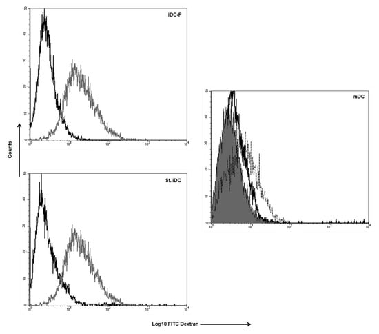 Uptake of FITC labeled dextran by DC. Histograms show the FACS analysis of the cell co-cultured with FITC labeled dextran at 37 °C (grey line) and non-specific labeling of the cells (black line) for iDC-F (immature Fast-DC); St. iDC (standard method immature DC). Mature DC (mDC) were analysed as negative control for dextran uptake (dotted line Fast method; black line standard method; solid line isotype). One representative performed experiment is presented.
