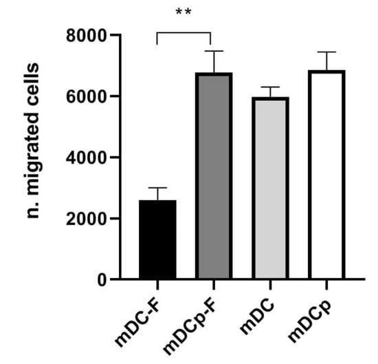 Mature DC (2 × 104) were seeded in a 4 μm insert (Corning) in 200 μL medium; in the lower chamber 600 μL medium containing 100 ng/mL of CCL21 (Sigma Aldrich) were added. After 3 h incubation at 37 °C, cells migrated into the lower compartment were collected. Samples were analyzed on a FACS Calibur (BD) after addition of propidium iodide (Sigma-Aldrich) in order to discriminate dead cells. Counting beads (Beckman Coulter, Brea, CA, USA) were added to the samples directly before measurement in order to normalize acquisition rates among the samples.