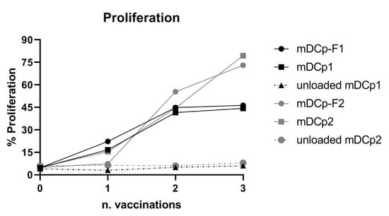 The T cell stimulatory capacity of Fast-DC was assessed and compared with that of standard DC using KLH as a model Ag. For proliferation tests the DC:T cell ratio was 1:10 for in vitro stimulation of 5 days prior to MTT analysis. Ag-loaded mDCp-F were effective in inducing the proliferation of autologous PBMC isolated from DC-vaccinated patients with a comparable potency respect to Ag-loaded mDCp (Figure 5). Unloaded DC did not induce proliferation.