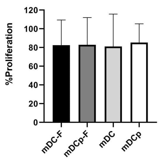 The capacity to promote T cell proliferation was also assessed in an allogeneic MLR, as MLR is the gold standard to test the functional ability of DCs as antigen-presenting cells [21] outside the context of antigen-specificity. T cells were co-cultured with any of the 4 types of DC (mDC, mDCp, mDC-F and mDCp-F) for 5 days and proliferation was measured by MMT test. The results in Figure 6 show that the 4 types of DC are equally powerful in inducing primary allogeneic MLRs.