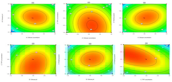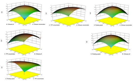 The regression equation shows that R2 = 0.9286, where the p-value of the misfit test was 0.0993, meaning that there was no significant difference with respect to the Pur error. This shows that the regression model was successfully fitted, and can accurately express the relationship between the response value and various factors and that we could use this model to speculate and analyze the experimental results. From the results of the significance test, it was found that C (CS concentration and TPP concentration) was significantly higher in the model (p < 0.05). In the results of the interaction terms, AB, AC, AD, BC, and BD all had p-values > 0.05, indicating that there were no significant differences between the interaction terms. Here, CD = 0.0006, a significant difference, indicating that the TPP concentration and speed had a significant effect on the nanoparticles and that the simultaneous change in TPP concentration and rotation speed had a great impact on the nanoparticles. This is consistent with the results obtained during the experiment, where CS concentration and TPP concentration were two factors that affected the particle size, PDI, encapsulation efficiency, and drug loading. Additionally, predicting the concentration of TPP was the main factor that affected the crosslinking effect and promoted the formation of a more uniform spatial network structure. As the TPP concentration increased slightly, the particle size of the nanoparticles immediately increased. A large amount of TPP would form more intramolecular cross-links with chitosan, which makes the molecules more easily polymerized, having a larger particle size and uneven distribution. Too little TPP resulted in less chitosan formation and less intramolecular cross-linking, making it difficult for the molecules to polymerize and load drugs. Therefore, a quadratic multiple regression equation was used to fit experimental data, determining the level of one factor as the center point and predicting the relationship diagram with the other three factors, as well as predicting the optimal prescription ratio of Pur CS nanoparticles. The results are shown in Figure 1.