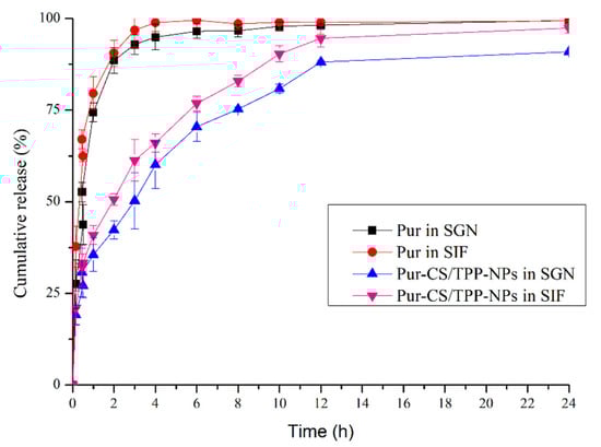 Accumulated release of Pur and Pur-CS/TPP-NPs under artificial gastric juice (SGN) and artificial intestinal fluid (SIF), respectively (n = 3, x ± s).