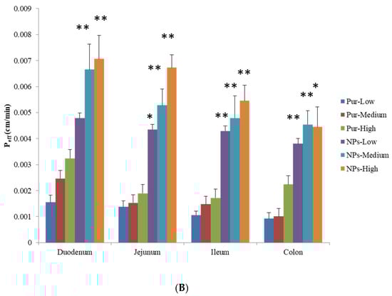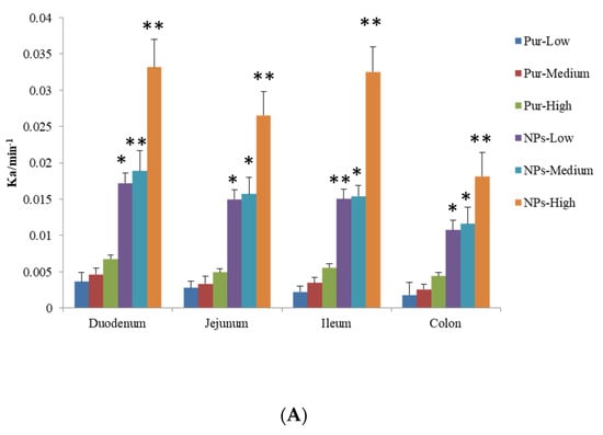 The permeability coefficients (Peff) and absorption rate constant (Ka) were obtained for Pur and the Pur-CS/TPP-NPs following in situ perfusion to the different segments. Details of this are presented in Figure 5. For the Pur group, the orders of Peff and Ka were duodenum > jejunum > ileal > colon, respectively, meaning that the absorption of Pur was the largest in the duodenum, followed by the jejunum, then the ileum, and the absorption of the colon was the weakest. There was a significant difference in the absorption of the duodenum and colon (p < 0.05), and there was no significant difference in the absorption between the jejunum and ileum (p > 0.05). Compared with the Pur and Pur-CS/TPP-NPs groups, the absorption of the four intestinal segments was significantly increased (p < 0.05), and there was also a significant difference between the three low, medium, and high concentrations (p < 0.05).