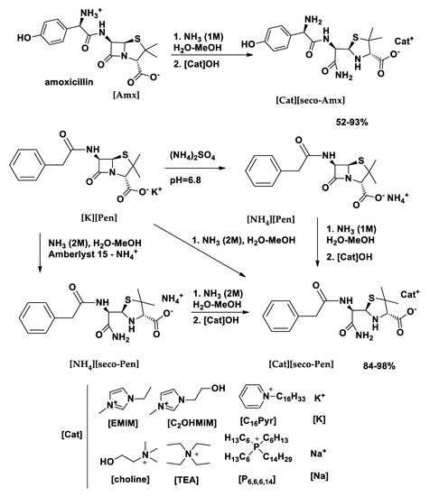 While amoxicillin (Amx) was used as provided (in trihydrate form), penicillin G, which was supplied as a potassium salt ([K][Pen]), was previously converted to the corresponding ammonium salt [NH4][Pen] by following the procedure of Brown et al. [62]. The experimental procedure consisted on the reaction of hydroxide of the selected cations with amoxicillin and penicillin ammonium salt. Halide (chloride, bromide) salts of selected organic cations were converted into the corresponding hydroxides on Amberlite resin (OH form), and the highly basic solution that was obtained was then added to the solution of the API in an aqueous ammonia buffer in order to provide the compounds [18]. [Na][seco-Amx] was prepared through a reaction with sodium hydroxide (instead of organic hydroxide), while a [K][seco-Pen] derivative was directly obtained by ammonolysis from [K][Pen].