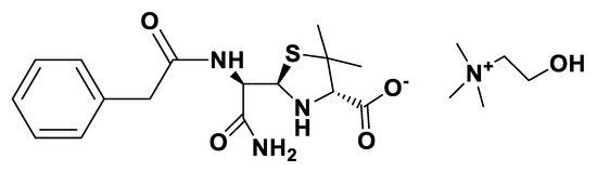 (2-hydroxyethyl)trimethylammonium chloride (0.277 g; 1.99 mmol) was dissolved in methanol and passed through an Amberlite IRA-400-OH ion-exchange column [18,99] (5 eq., flux rate 0.133 mLmL−1min−1 = 8 BVh−1). Then, the hydroxide solution that was formed was slowly added to ammonium penicillin G (0.848 g; 2.41 mmol) that was dissolved in a 1.0 M aqueous ammonium solution (50 mgmL−1). The mixture was stirred at room temperature for 1 h. After solvent evaporation, the residue was dissolved in a 20 mL solution (methanol/acetonitrile 1:9) [18,99] and left refrigerated overnight (4 °C) [18,99] to induce the precipitation of the excess reagent. When the reagent crystals were filtered out, the solution was evaporated, and the rest was dried in a vacuum for 24 h to provide the desired product as a yellow solid (0.856 g; 95%). m.p. 69–71 °C; [α]D25 = 47.3 ± 3.6 (c = 2 mgmL−1 in methanol); 1H-NMR (400.13 MHz, CD3OD) δ = 7.33–7.29 (m, 5H), 4.95 (d, 1H, J1 = 7.0 Hz), 4.35 (d, 1H, J1 = 7.0 Hz), 4.02–3.98 (m, 2H), 3.66–3.56 (m, 2H), 3.50-3.47 (m, 3H), 3.20 (s, 9H) 1.56 (s, 3H), 1.25 (s, 3H) ppm; 13C-NMR (100.62 MHz, CD3OD) δ = 174.72, 174.37, 174.15, 140.88, 136.73, 130.31, 130.25, 129.63, 127.96, 75.73, 69.06, 66.67, 60.20, 60.04, 59.53, 57.10, 46.65, 27.78, 27.47 ppm; IR (KBr): υ = 3468, 3074, 2966, 1652, 1496, 1479, 1461, 1396, 1356, 1279, 1204, 1131, 1083, 1054, 1010, 955, 887, 867, 796, 734, 702, 670, 620, 540, 476 cm−1; (ESI+) m/z calculated for C5H14NO+: 104.1, found 104.1; (ESI) m/z calculated for C16H20N3O4S 350.1, found 349.9.