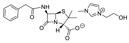 IR spectra were measured on a Perkin Elmer 683 by using KBr sample disks. Optical rotations were recorded on a Perkin Elmer 241MC. The melting temperature (mT) was determined with a melting point apparatus (Stuart Scientific). The elemental analysis experiments were performed in a CHNS Series Thermo Finnigan-CE Instruments Flash EA 1112 under standard conditions (T combustion reactor 900 °C, T GC column furnace 65 °C, multiseparation SS GC column, He2 flow 130 mL/min, O2 flow 250 mL/min). The penicillin G potassium was transformed in penicillin G ammonium by the adaptation of the method of Salivar, C. J. et al. [63]. Figure 2, Figure 3, Figure 4, Figure 5, Figure 6, Figure 7, Figure 8, Figure 9, Figure 10, Figure 11, Figure 12, Figure 13, Figure 14, Figure 15 and Figure 16 illustrate the chemical structures of all prepared OSILs based APIs.