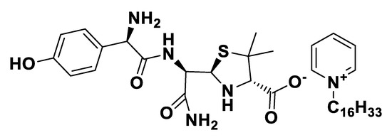 Hydrolyzed amoxicillin (seco-Amx) and penicillin G (seco-Pen) derivatives in the anionic form were combined with the following organic cations (see Figure 1): 1-ethyl-3-methylimidazolium [EMIM], 1-hydroxy-ethyl-3-methylimidazolium [C2OHMIM], (2-hydroxyethyl)trimethylammonium [Choline], tetraethylammonium [TEA], cetylpyridinium [C16Pyr] and trihexyltetradecylphosphonium [P6,6,6,14]. These cations were selected due to their low toxicity, except for [P6,6,6,14], which was chosen because it usually produces room temperature ionic liquids (RTILs). Cetylpyridinium chloride is also already used in some types of mouthwashes and toothpastes [53], although it is irritant in higher concentrations [54]. For control purposes in the biological activity studies, we also prepared the corresponding sodium and potassium salts of the hydrolyzed antibiotics by following the same synthetic procedure.