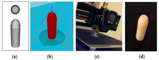 The 3D printing of a hollow suppository shell with an orifice: (a) Computer-aided design (CAD) of a suppository shell (top and side); (b) stereolithography (STL) image for 3D printing; (c) 3D printing of a polyvinylalcohol (PVA) shell; (d) a 3D-printed hollow suppository shell with an orifice on top.