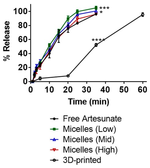 Release profiles of artesunate in PBS (pH 7, 37 °C). At 30 min, free artesunate vs. micelles (mid): * p = 0.0240; free artesunate vs. micelles (low): *** p = 0.0002; free artesunate vs. 3D printed: **** p < 0.0001.