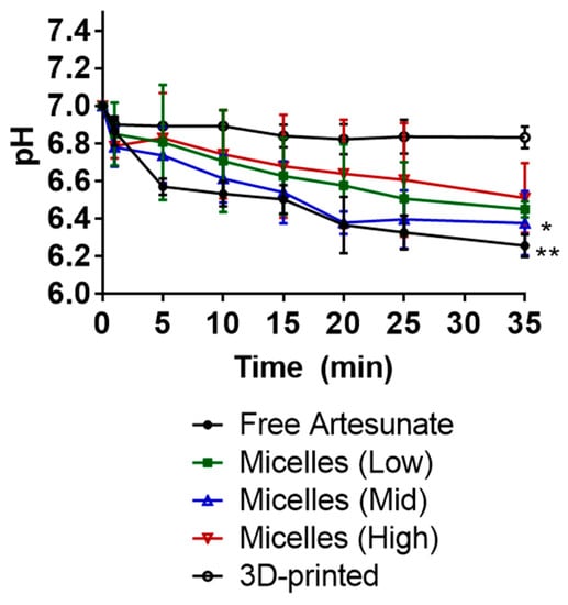 pH change in PBS (pH 7, 37 °C) medium upon drug release in vitro. At 30 min, 3D printed vs. micelles (mid): * p = 0.0256; 3D printed vs. free artesunate: ** p = 0.0063.