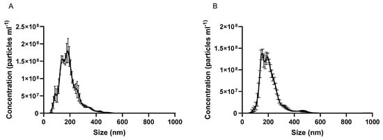 Nanoparticle tracking analysis (NTA) graphs of (A) cow milk extracellular vesicles and (B) Caco-2 cell-derived extracellular vesicles. Data are shown as mean +/− SD (n = 3).