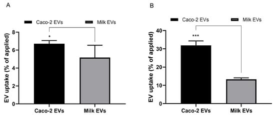 The cellular uptake of milk- and cell-derived EVs in undifferentiated and differentiated Caco-2 cells following 4-h incubation is shown in Figure 2 (A and B, respectively). Figure 2A shows that 5% of the applied amount of milk EVs were taken up by cells (48-well plate format). Uptake of cell EVs amounted to 6.7% of the applied dose per well.