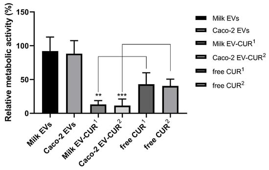 Antiproliferative activity of extracellular vesicle-incorporated curcumin (EV-CUR) and free curcumin (CUR) in Caco-2 cells. Triton X-100 (0.1% v/v) and exosome-depleted culture medium were used as controls relative to which metabolic activity of samples was calculated. Cells were treated with milk EV-CUR1 (4.5 µg/mL), free CUR1 (4.5 µg/mL), Caco-2 EV-CUR2 (1.5 µg/mL), free CUR2 (1.5 µg/mL). Data shown as the mean +/− SD (n = 6). ** and *** denotes p < 0.005 and p < 0.001, respectively.