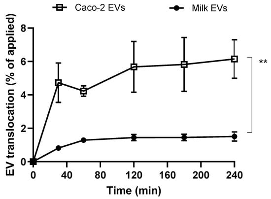 Translocation of milk-derived extracellular vesicles (EVs) and cell-derived EVs in differentiated/polarised Caco-2 cells. Data shown as the mean +/− SD (n = 3). ** denotes p < 0.01.