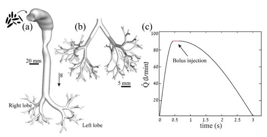 - Ma, B.; Lutchen, K.R. CFD Simulation of Aerosol Deposition in an Anatomically Based Human Large—Medium Airway Model. Ann. Biomed. Eng. 2008, 37, 271. [Google Scholar] [CrossRef]