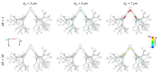 Deposition maps for fibers with different aspect ratios (rows) and equivalent diameters (columns) at the end of the DPI maneuver (t = 3 s) in the nine-generation bronchial tree domain. Particle deposition is color coded (1–500) according to the number of neighbors within a 5 mm radius. It is clear that particles of dp > 2 µm fibers deposit less and disperse more compared to spheres. We note that as dp increases, particles are strongly influenced by impaction and sedimentation at the carinas, causing them to be deposited, although they are more dispersed as the AR increases.