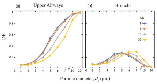Figure 4 summarizes the ensuing deposition efficiencies (DE) in the upper airways and the bronchial tree at the end of the DPI maneuver (t = 3 s). Here, our in silico results suggest that the DE of particles in the upper airways increase monotonically with dp. However, as AR increases, particles are screened through the first seven generations and enter into the bronchial tree, thereby translating into a lower DE. For dp > 20 , all particles are deposited, regardless of the AR. We recall that in the nine-generation bronchial tree, DE is calculated after reducing the particles that have already been deposited in the upper airways, such that deposition outcomes appear to be an optimum achieved between convection of small particles (dp < 4 to impaction and sedimentation of large particles (dp > 7 . Here, an increase in AR is seen to shift the optimum from dp = 5 for spheres to dp = 7 for fibers of AR = 30.