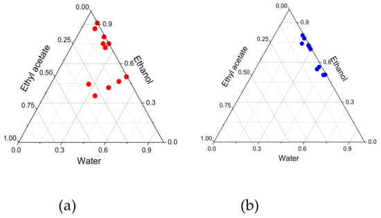 Once ethanol was selected, the next stage in lacquer optimization was to determine the water and ethanol ratio necessary for ensuring that the 8% ciclopirox dose dissolves, and to promote high permeability. A third volatile solvent, ethyl acetate, was included in the vehicle in order to obtain bases that spread easily across the nail and evaporated relatively quickly for enhanced patient acceptance. Based on a composition of 10% HPB, 5% Pluronic® F125, and 1% SLS, different vehicles were prepared to change the proportions of water, ethanol, and ethyl acetate in the blends. For the purpose of their evaluation, direct macroscopic observation was performed to check in which blends the 80 μg/mL dose of ciclopirox olamine or ciclopirox base was fully dissolved, subsequently measuring in same the final concentration by means of UV–vis spectroscopy to confirm that it had fully dissolved. Ternary diagrams were drawn using the results in order to establish the areas of interest (Figure 2).