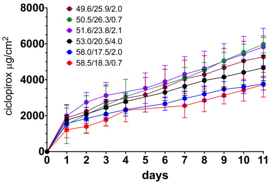 Figure 3 shows the base hoof permeation kinetics of ciclopirox over 11 days for different vehicle compositions. The penetration rate was highest during the first day of lacquer application, and the flux stabilized thereafter, showing a linear increase over time of the amount diffused.